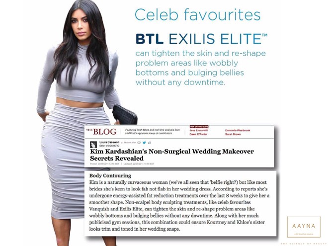 Người mẫu, diễn viên nóng bỏng Kim Kardashian – Kim siêu vòng 3 lại vô cùng quan tâm đến việc duy trì thân hình săn chắc, làn da cơ thể căng mịn. Vì thế, cô kết thân với công nghệ Sóng Cao Tần (Exilis) – công nghệ vừa có khả năng giảm béo, săn chắc cơ thể đỉnh cao, lại vừa vô cùng hiệu nghiệm trong việc tăng sinh collagen, từ đó làm trẻ hóa, xóa nhăn da hiệu quả.