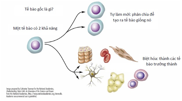 Tế bào gốc là tế bào có khả năng phát triển thành nhiều loại tế bào khác nhau trên cơ thể. Trong các cơ quan của cơ thể người, tế bào gốc có vai trò như một hệ thống sửa chữa nội bộ. Dựa trên khả năng biệt hóa của tế bào gốc, người ta phân chia ra làm 3 nhóm chính: tế bào gốc toàn năng (totipotent), tế bào gốc vạn năng (Pluripotent) và tế bào gốc đa năng (Multipotent). Hai nhóm đầu được tìm thấy trong giai đoạn phôi thai. Nhóm thứ 3 được tìm thấy trong nhiều loại mô ở người trưởng thành (tủy xương, da, gan, mô mỡ,…), và từ máu từ cuống rốn trẻ sơ sinh, răng sữa trẻ em.